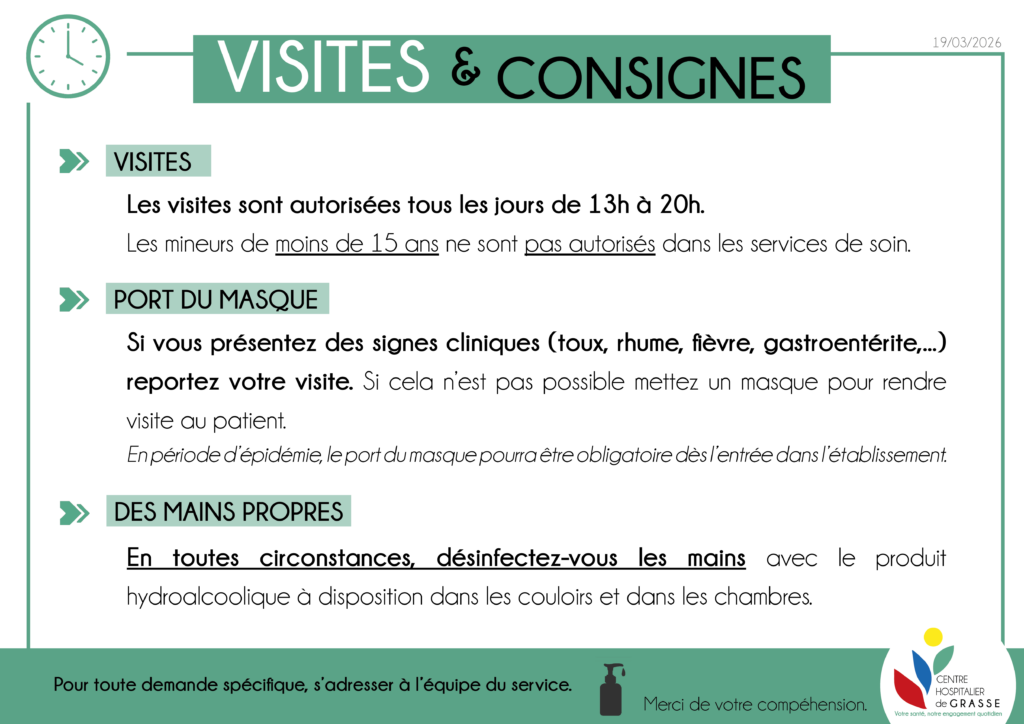 Le Centre Hospitalier de Grasse met tout en œuvre pour que le séjour de vos proches se déroule dans les meilleures conditions possibles. Nous savons qu’être auprès d’un proche hospitalisé est une situation particulière, c’est pourquoi nous proposons divers services pour vous accompagner tout au long de votre visite.
